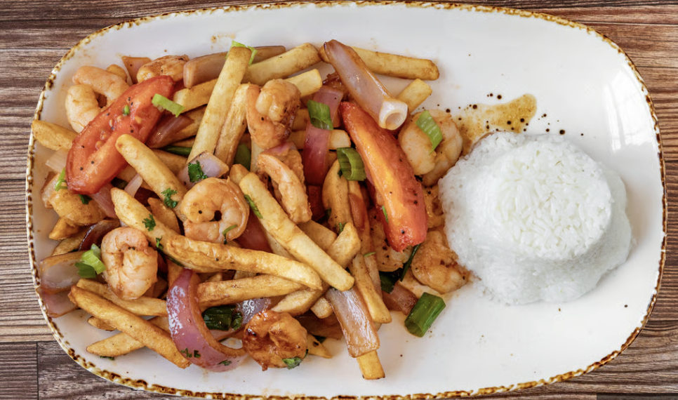 Camarones salteados a fuego alto con cebolla, tomate y sazón peruana, logrando un sabor jugoso y ahumado. Servido con arroz y papas doradas.